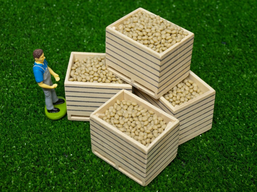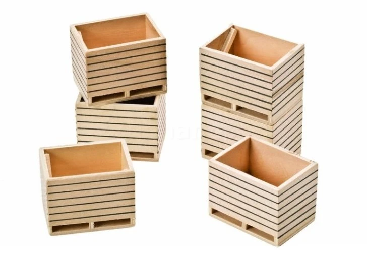 Echte aardappelen worden van het labnd gehaald en verzameld in grote houten kisten. Dit pakketje bevat 6 aardappelkisten op schaal 1 : 32.